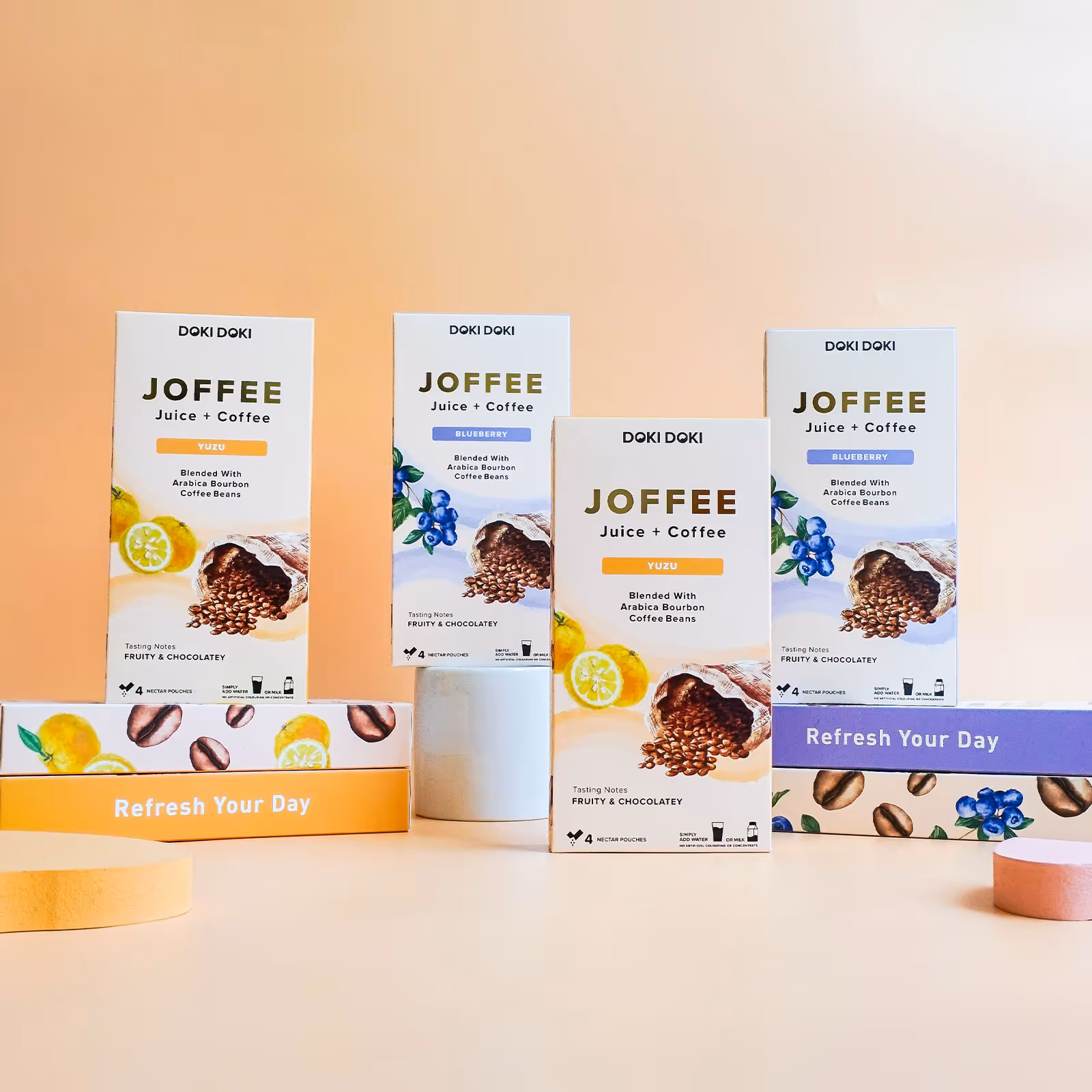 Joffee is the refreshing combination of Arabica Bourbon coffee beans and whole fruits. Blended into nectar so you can enjoy your cup of joe fuss-free.
